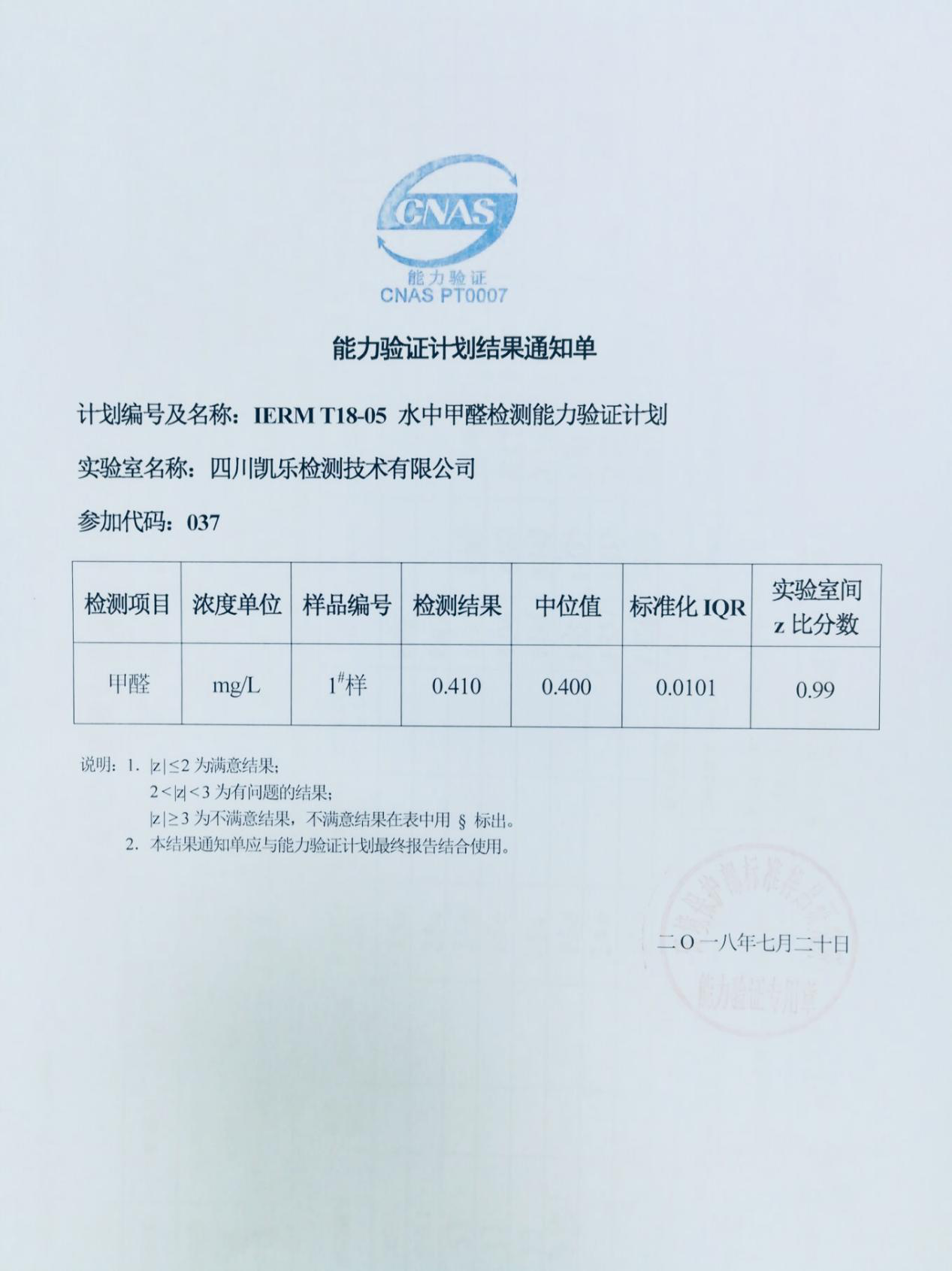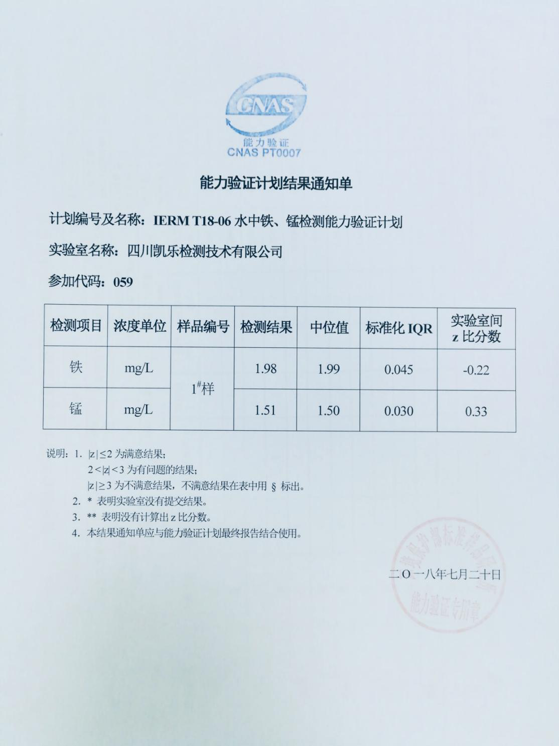 今年五月份我公司积极参加了由环境保护部标准样品研究所组织实施的“IERM T18-05 水中甲醛检测”、“IERM T18-06水中铁、锰检测”等两项能力验证于2018年7月20日顺利通过,结果均为“满意”,并获得能力验证结果认可证书。