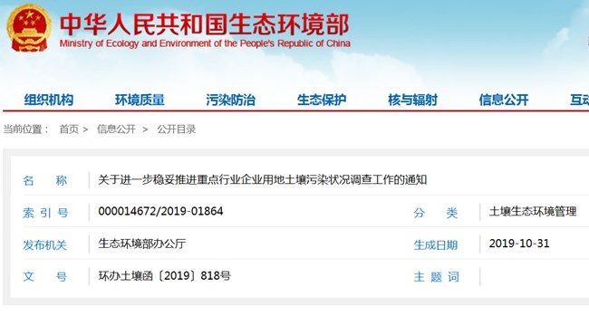 生态环境部日前发布通知,要求进一步稳妥推进重点行业企业用地土壤污染状况调查工作,按时保质完成企业用地调查2019年工作任务。